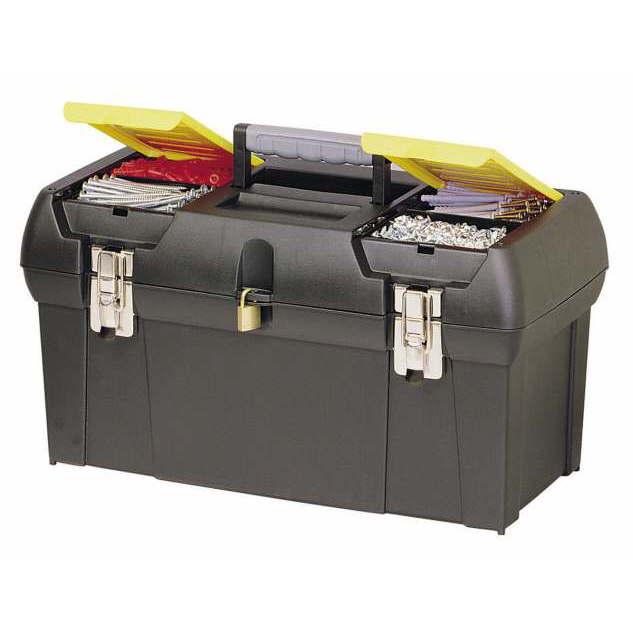 Gereedschapskoffer Stanley Batipro 60cm met 2 compartimenten voor bouten en moeren in het deksel. Afmetingen (cm) 92-067: 61 x 27 x 28,4.