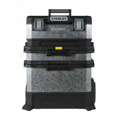 Gereedschapswagen Stanley MP galva met 3 compartimenten en ruime uitschuifbare bak voor groot gereedschap. Afneembare gereedschapskoffer met uitneembare gereedschapsbak en deksel met antislip en v-groef. Telescopische handgreep en grote wielen. Afmetingen (cm) 73 x 56,8 x 38,9.