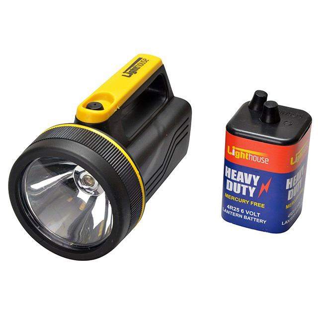 Lighthouse spotlight krypton met 6v batterij 996. Een ABS behuizing spat en stof afstotend. Dimensies: 182 x 125 x 112mm.