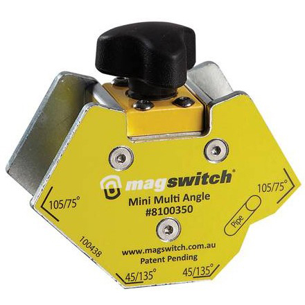 Lasmagneet mini multihoek klem 40kg aan-uit Magswitch. De klem bevat de volgende klemhoeken:45°, 60°, 75° en 90°.Een klemcapaciteit tot 40 kg op 0,6 mm staal.