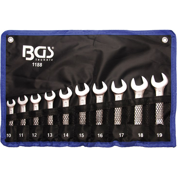 Ring-steeksleutelset kort, 10 delig BGS-1188. Door korte handzame formaat makkelijk te gebruiken als weinig ruimte beschikbaar is. Maten 10 – 11 – 12 – 13 – 14 – 15 – 16 – 17 – 18 – 19 mm.