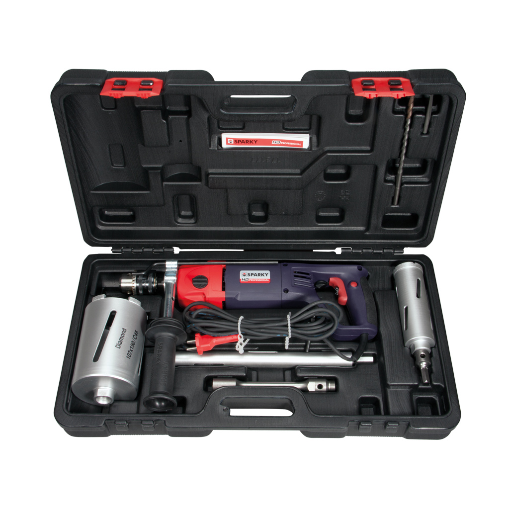 Heavy duty klopboor van 1100W met D-handvat en 2 versnellingen. Geleverd in koffer inclusief diamanten boorkronen en toebehoren om gaten te kunnen boren van 107 mm, 52 mm en 28 mm.