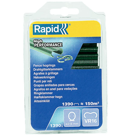 Hekwerk hogringen groen gegalvaniseerd Rapid VR16 1390 stuks. Geschikt voor een diameter van 2-8 mm en ideaal voor het vastzetten van kooien, hekwerk of het beschermen en vastzetten van jonge planten.