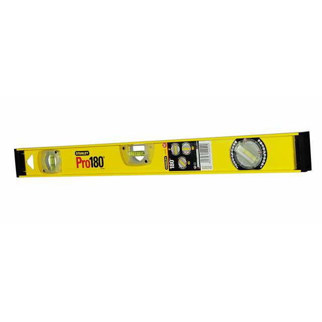 Waterpas PRO-180 I-Profiel 3 libellen 120cm Stanley. Duurzame aluminium steunbalk voor zwaar werk. 3 buisvormige libellen: 1x verticaal, 1x horizontaal, 1x 180° verstelbaar. Nauwkeurigheid: 1,5mm/m.